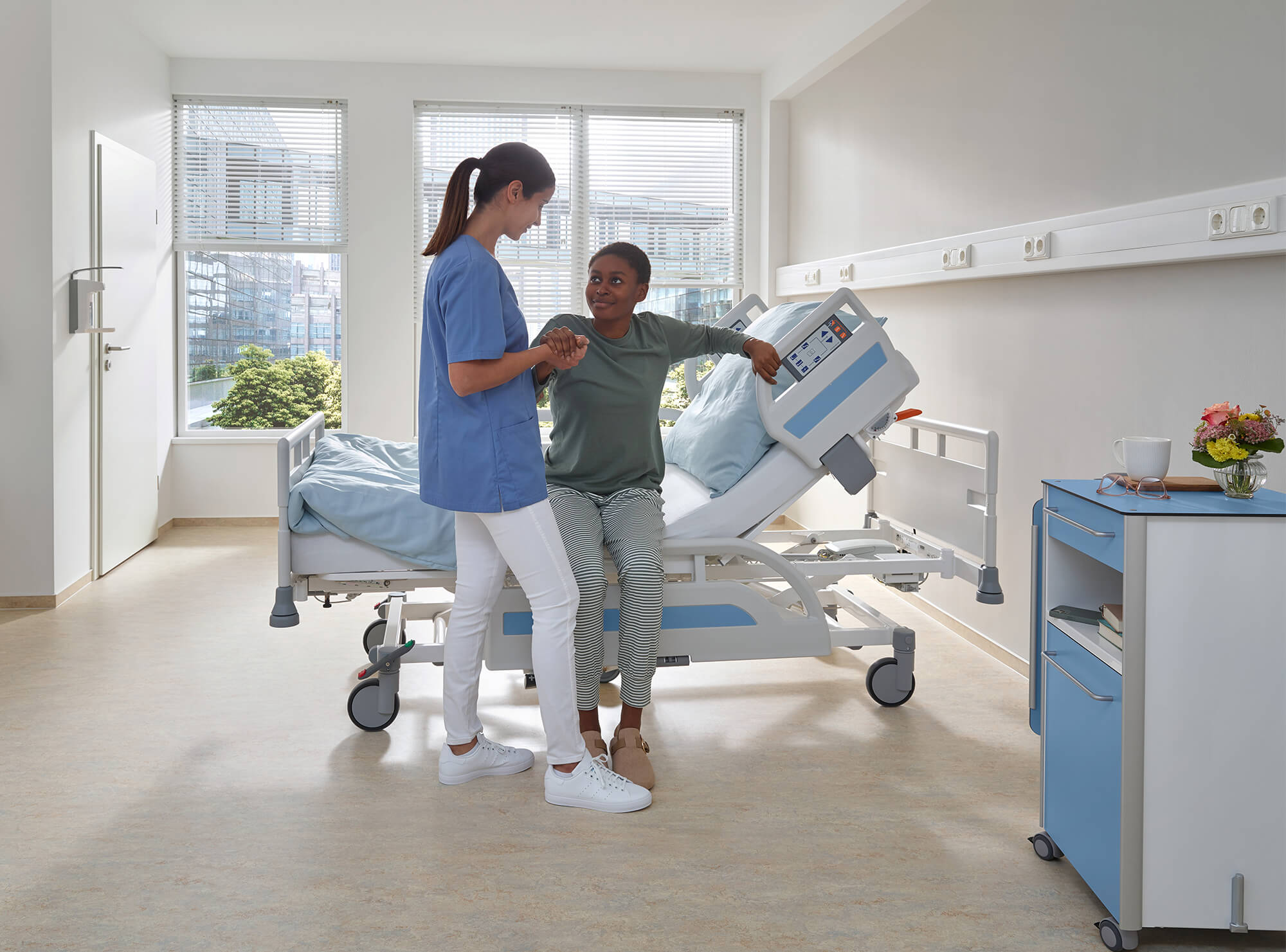 Evario one 集合多种理想的资源:符合人体工学的手持遥控,与分体式安全护栏配合使用的轻型集成控制面板,位于床尾的护士控制面板有不同尺寸选项(S和M),以及方便的脚踏板可用于调节高度。针对不同的使用类型,均有理想的组合可供选择。